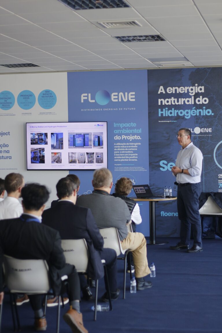 Seguiu-se uma deslocação à Gestene, onde o Engenheiro Carlos Mendes (Presidente da Gestene) partilhou toda a experiência do processo de produção e armazenamento do Hidrogénio Verde, levando ainda os envolvidos nesta ação a conhecer o eletrolisador.