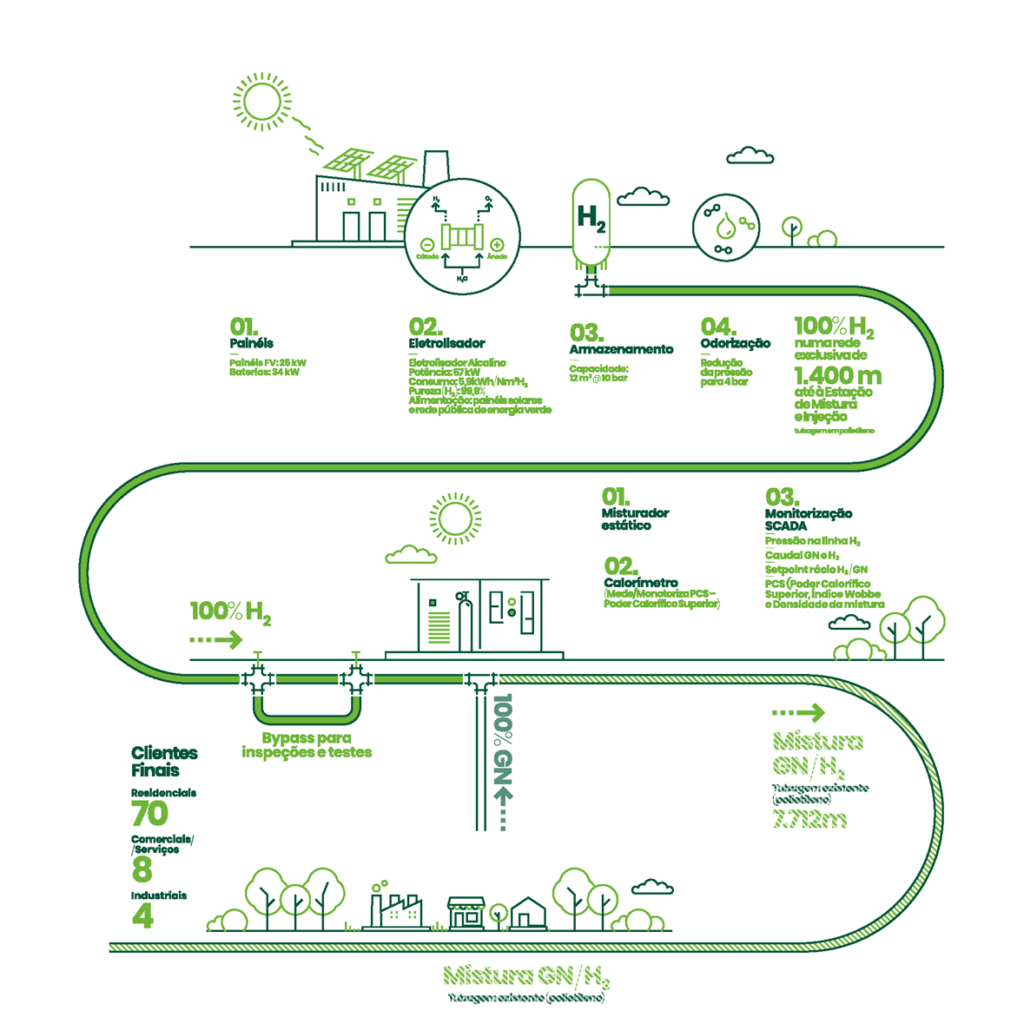 Existem duas redes envolvidas neste projeto de sustentabilidade. Uma primeira rede, com uma extensão de aproximadamente 1400 metros, dedicada ao transporte de hidrogénio com 99% de pureza, sendo o primeiro troço da rede de distribuição de gás exclusivamente dedicado ao transporte de hidrogénio verde. Este troço levará o vetor energético desde o seu local de produção (Gestene), até à estação de mistura e injeção. A estação de mistura e injeção contém uma misturadora, para garantir a proporção pretendida de hidrogénio com o gás natural, que irá variar entre os 2% e os 20% em volume, um calorímetro, que medirá o poder calorífico da mistura, e um sistema de controlo e monitorização.